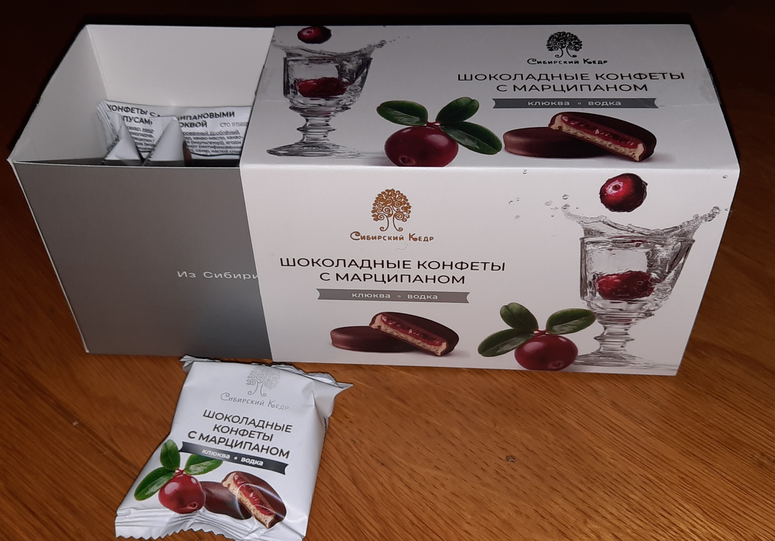 сахар, миндаль бланшированный дроблёный, патока, шоколадная глазурь (сахар, какао-масло, какао-порошок, лецитин подсолнечный (эмульгатор)), ягоды малины, водка (вода питьевая, спирт ректификованный «Люкс» из пищевого сырья (зерно), сахар, настой спиртованный кедровых орехов очищенных), ядро кедрового ореха тёртое, лецитин подсолнечный (эмульгатор), пектин (желирующий агент), лимонная кислота (регулятор кислотности), экстракт ванили натуральный, ароматизатор пищевой — апероль спритц.